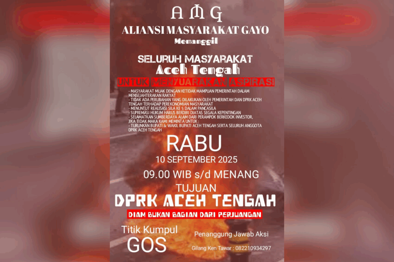 SuaraParlemen.co, Takengon – Aliansi Masyarakat Gayo (AMG) berencana menggelar aksi unjuk rasa di Gedung Dewan Perwakilan Rakyat Kabupaten (DPRK) Aceh Tengah pada Rabu, 10 September 2025, mulai pukul 09.00 WIB hingga selesai.
