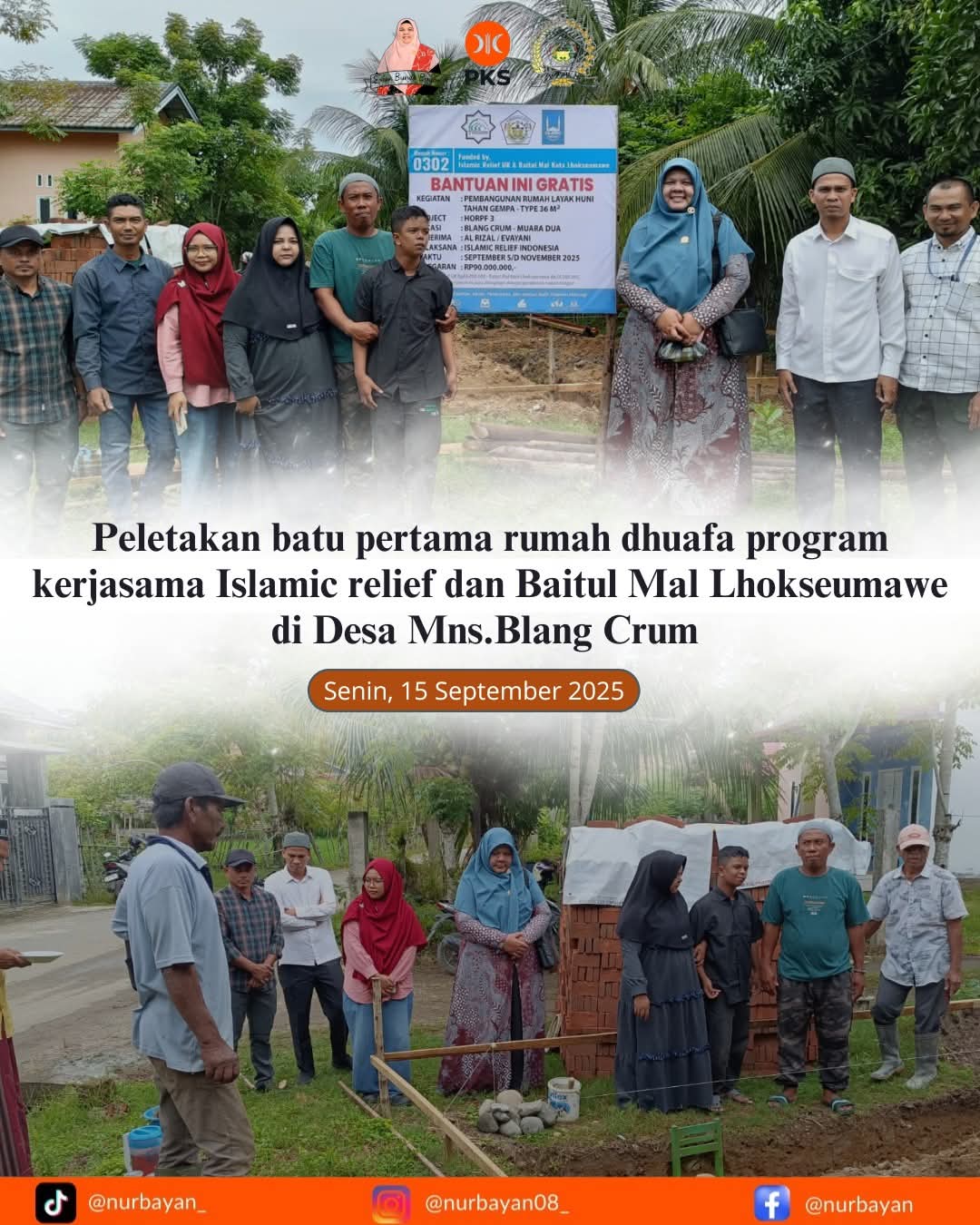 SuaraParlemen.co, Lhokseumawe – Anggota DPRK Lhokseumawe, Nurbayan, S.Sos.I, melaksanakan kegiatan sosial berupa peletakan batu pertama pembangunan rumah dhuafa di Desa Blang Crum, Rabu (17/9/2025). Program ini terlaksana berkat kerja sama dengan Islamic Relief dan Baitul Mal Kota Lhokseumawe.