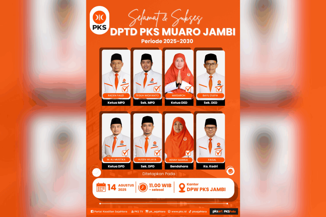 SuaraParlemen.co, Jambi — Partai Keadilan Sejahtera (PKS) resmi menetapkan susunan Dewan Pimpinan Tingkat Daerah (DPTD) se-Indonesia untuk masa bakti 2025–2030 pada Kamis (14/8/2025). Pengumuman ini dilakukan serentak oleh DPP PKS di seluruh wilayah, disiarkan langsung melalui PKS TV dan kanal YouTube DPW di berbagai provinsi, termasuk DPW PKS Jambi.