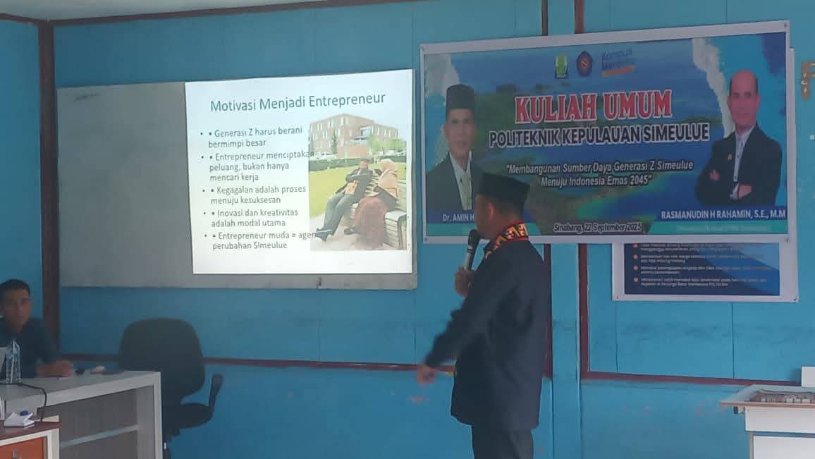 SuaraParlemen.co, Simeulue – Ketua Dewan Perwakilan Rakyat Kabupaten (DPRK) Simeulue, Rasmanudin H. Rahamin, S.E., M.M., hadir sebagai narasumber dalam kuliah umum yang digelar di Kampus Politeknik Kepulauan Simeulue pada Senin (22/9/2025). Kegiatan ini mengangkat tema “Membangun Sumber Daya Generasi Z Simeulue Menuju Indonesia Emas 2045”.