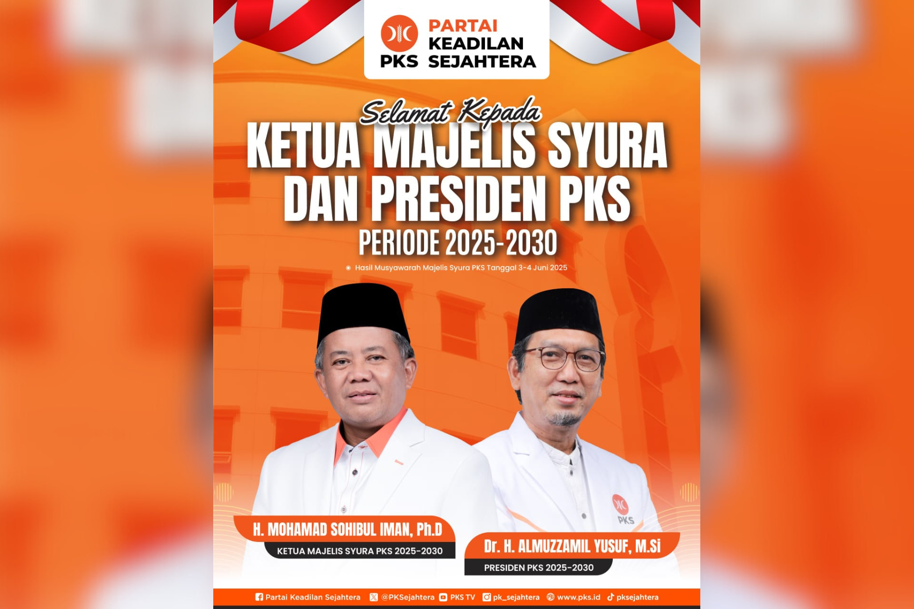 SuaraParlemen.co, Jakarta — Partai Keadilan Sejahtera (PKS) resmi menetapkan formasi kepemimpinan nasional untuk periode 2025–2030 melalui Musyawarah I Majelis Syura yang digelar pada Selasa–Rabu, 3–4 Juni 2025. Hasil musyawarah mufakat itu menetapkan H. Mohamad Sohibul Iman, Ph.D. sebagai Ketua Majelis Syura PKS, dan Dr. H. Almuzzammil Yusuf, M.Si. sebagai Presiden PKS yang baru.