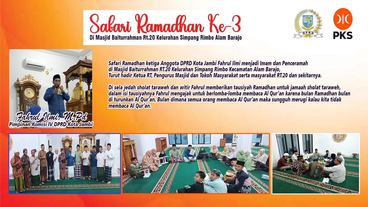 SuaraParlemen.co, Kota Jambi – Safari Ramadhan Anggota DPRD Kota Jambi, Fahrul Ilmi, M.Pd, berlanjut ke Masjid Baiturrahman RT.20 Kelurahan Simpang Rimbo, Kecamatan Alam Barajo. Dalam kegiatan tersebut, Fahrul bertindak sebagai imam dan penceramah sholat tarawih.