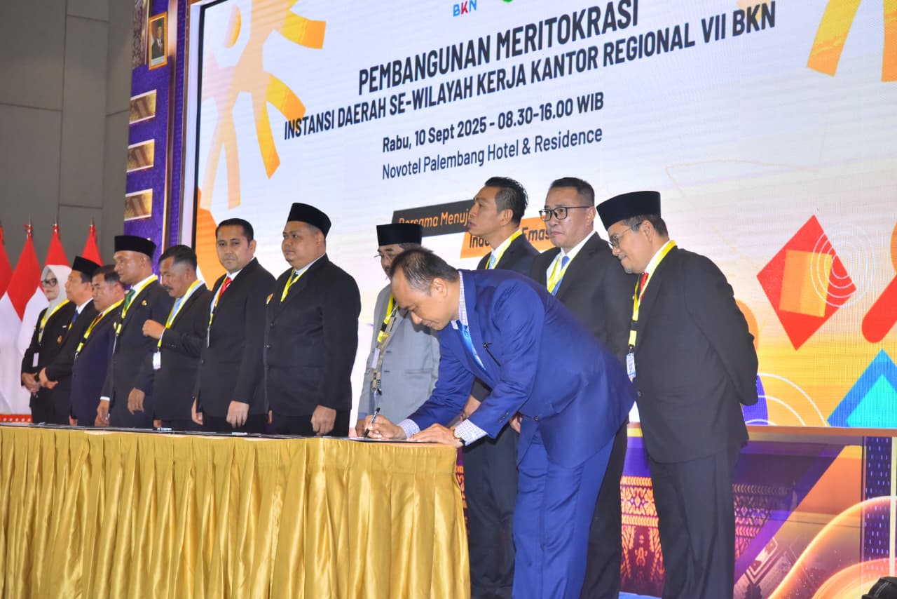 Penandatanganan bersama seluruh kepala daerah ini menandakan kolaborasi yang kuat antarinstansi dalam memajukan sistem kepegawaian yang profesional dan berbasis kinerja.